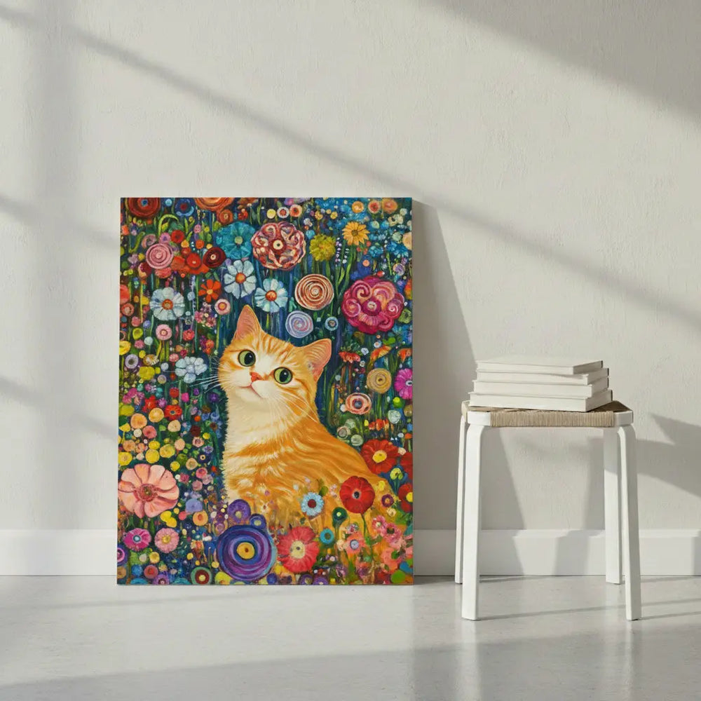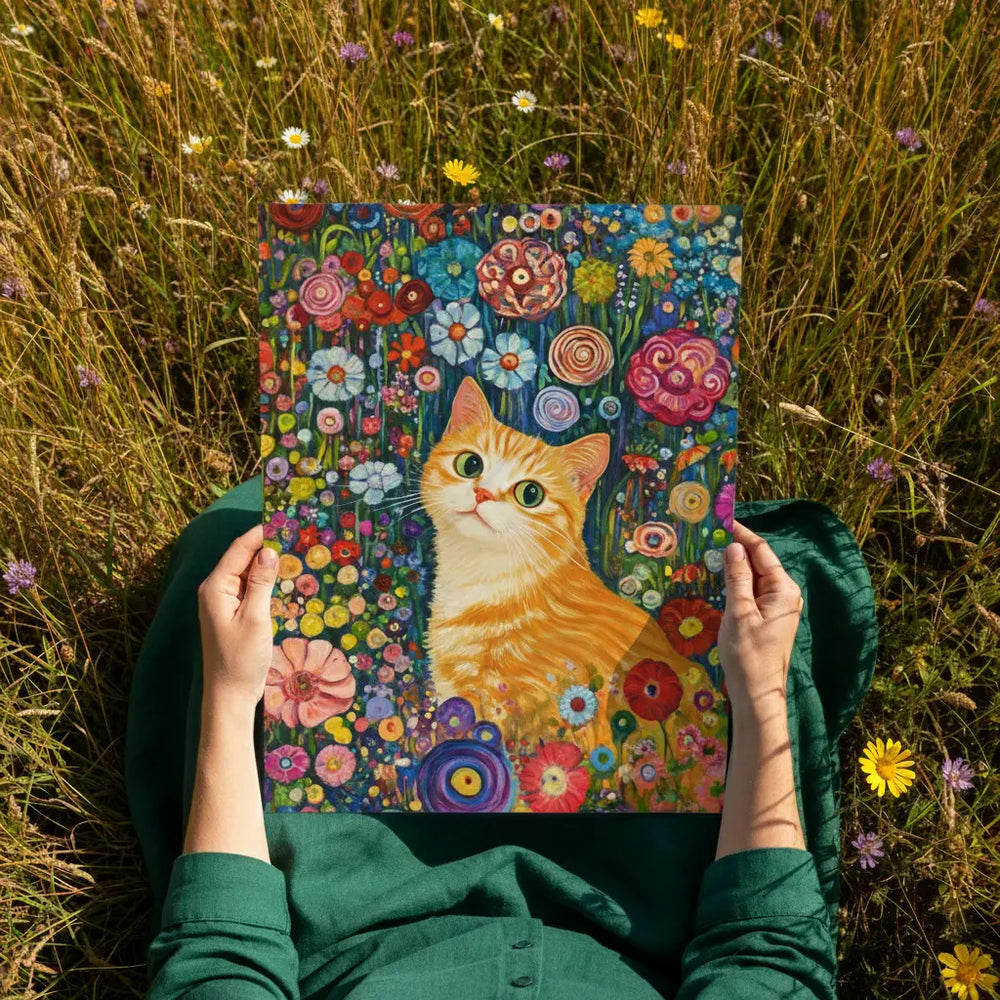The poster portrays a whimsical scene where a ginger cat explores a lush floral garden, creating a serene yet playful atmosphere. The detailed illustrations highlight the delicate petals, vibrant greenery, and the cat’s expressive posture, making it not just a decorative piece but a conversation starter. Whether you’re decorating a bedroom wall or looking for a cheerful accent for your office, this artwork elevates your space effortlessly.